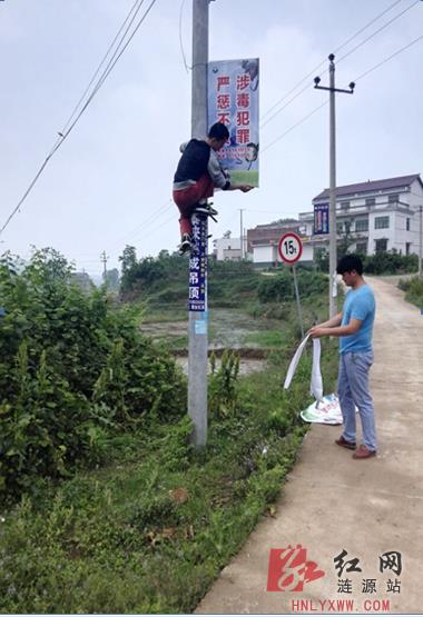 红网涟源站5月11日讯 (通讯员 易立文)为营造浓厚的禁毒氛围,使渡头塘镇广大群众充分了解毒品的危害,进一步树立村民远离毒品,抵制毒品的意识,5月6日,该镇禁毒办工作人员,顶着烈日,到全镇各村马路沿线爬杆悬挂禁毒宣传标语。