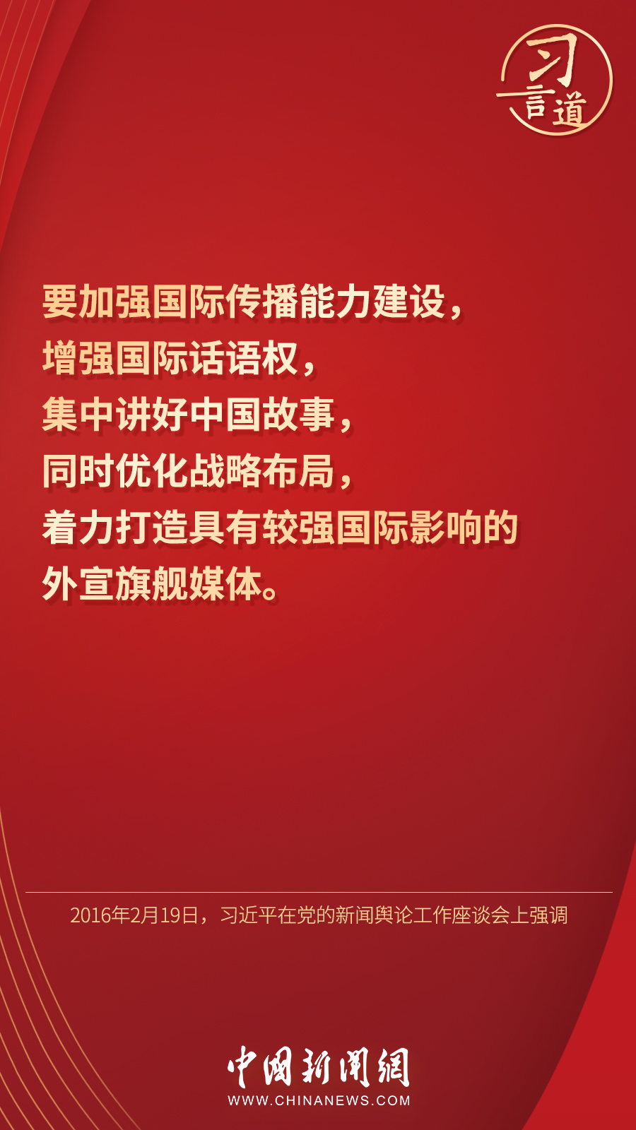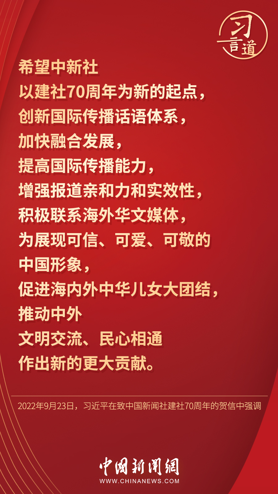 —分享— 9月23日,习近平总书记在致中国新闻社建社70周年的贺信中强调,创新国际传播话语体系,加快融合发展,提高国际传播能力,增强报道亲和力和实效性。十八大以来,习近平高度重视我国国际传播能力建设,做出了一系列重要论述—— 来源:中国新闻网 编辑:吴一夫