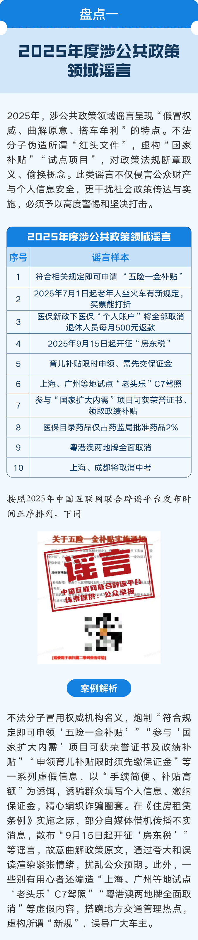 为坚决遏制谣言传播,净化网络生态,在中央网信办违法和不良信息举报中心指导下,中国互联网联合辟谣平台持续发挥权威辟谣主力军作用。2025年共发布各类辟谣稿件1.7万余篇,推出12期《月度辟谣榜》、248期《今日辟谣榜》,《今日辟谣榜》荣获“2025年网络文明建设优秀案例”。与中国人民银行、中国科协等多部门联合发布《经济金融领域年度网络辟谣榜》《利用AI生成类谣言辟谣典型案例》《科学领域流言月榜》等多份专项辟谣榜单,及时阻断网络谣言传播。