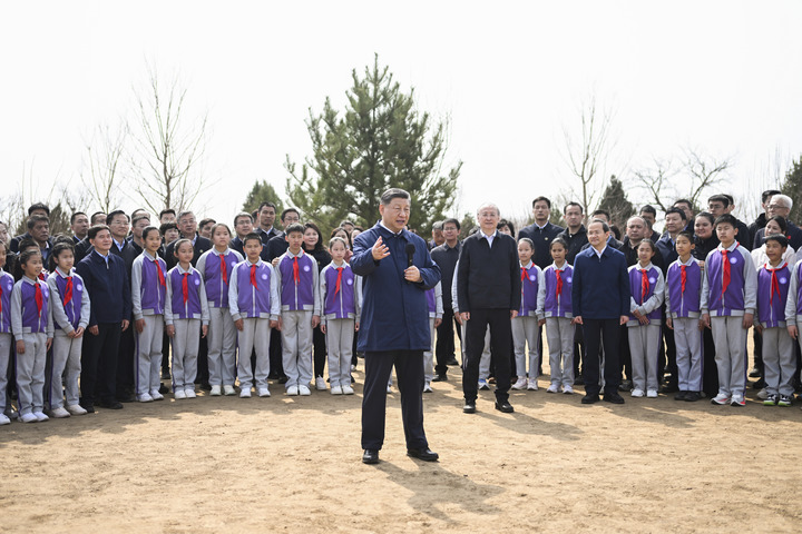 3月30日,党和国家领导人习近平、李强、赵乐际、王沪宁、蔡奇、丁薛祥、李希等来到北京市昌平区百善镇参加首都义务植树活动。这是习近平同在场的干部群众、少先队员亲切交谈。新华社记者 燕雁 摄