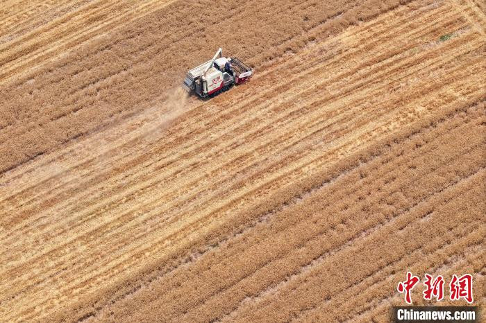 资料图:江苏南京,工作人员驾驶农机在江北一处田间收割小麦。(无人机照片)中新社记者 泱波 摄