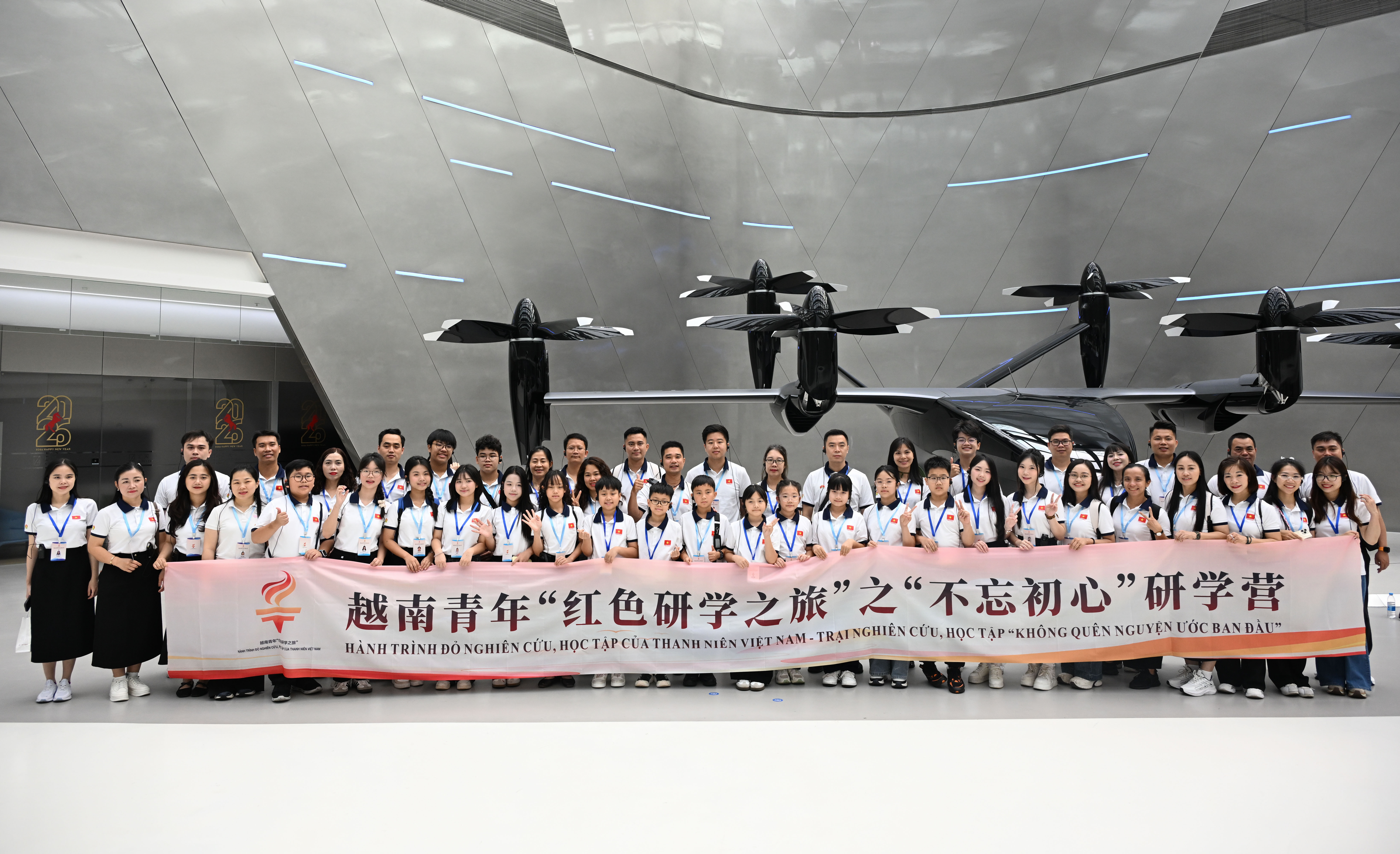 4月13日,越南青少年在广州的小鹏科技园合影留念。