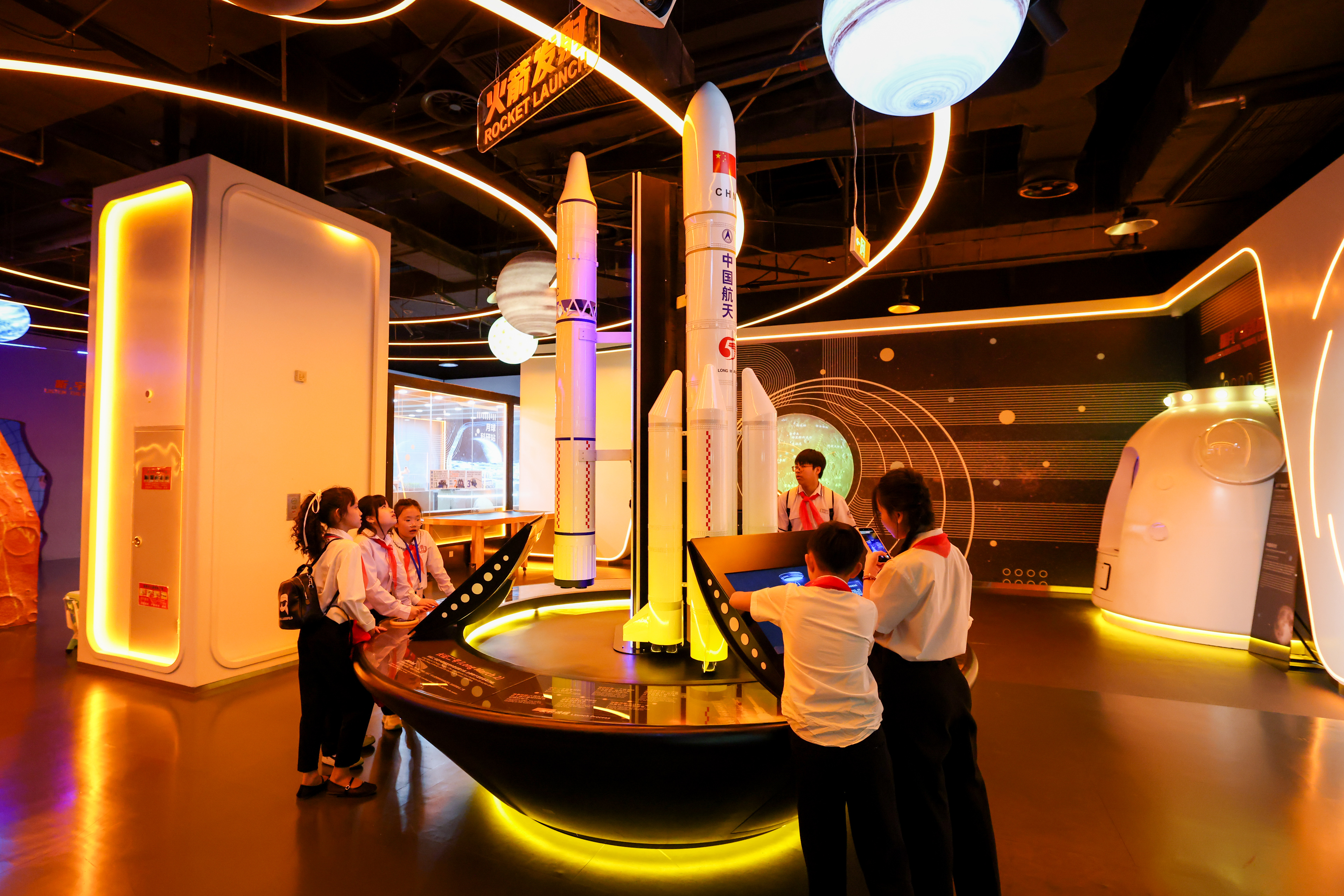 4月14日,越南青少年在位于北京的中国宋庆龄青少年科技文化交流中心了解航天知识。