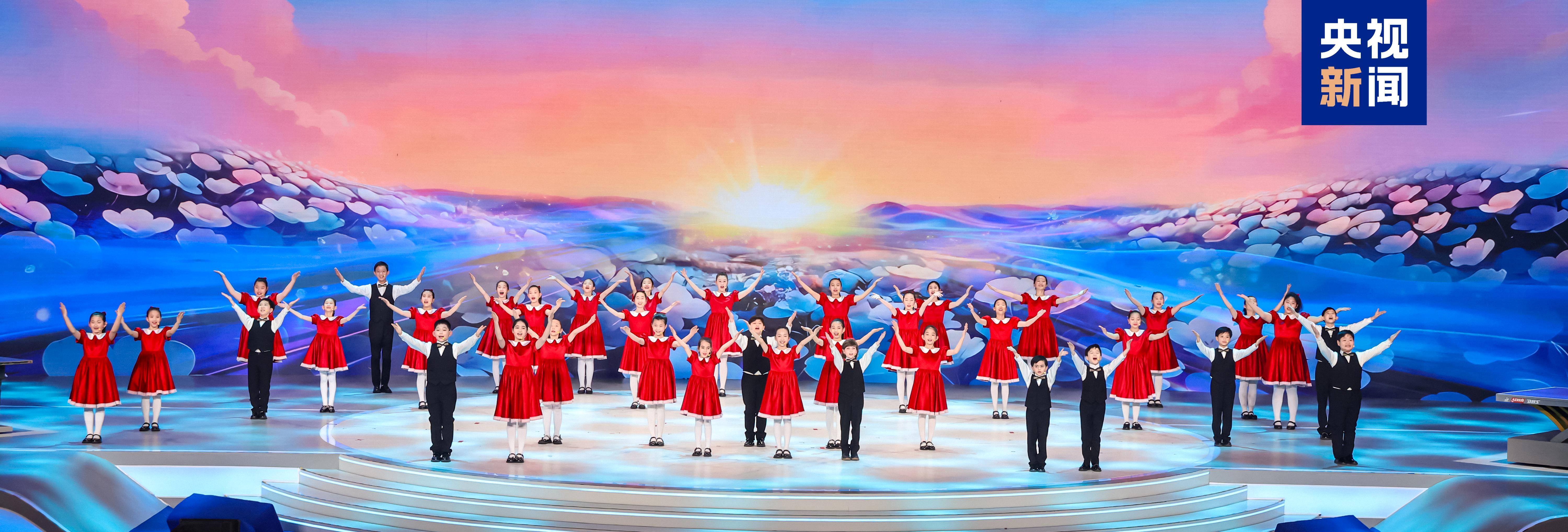 △中美“乒乓外交”55周年纪念大会上,中美青少年合唱歌曲《银球飞舞花盛开》。