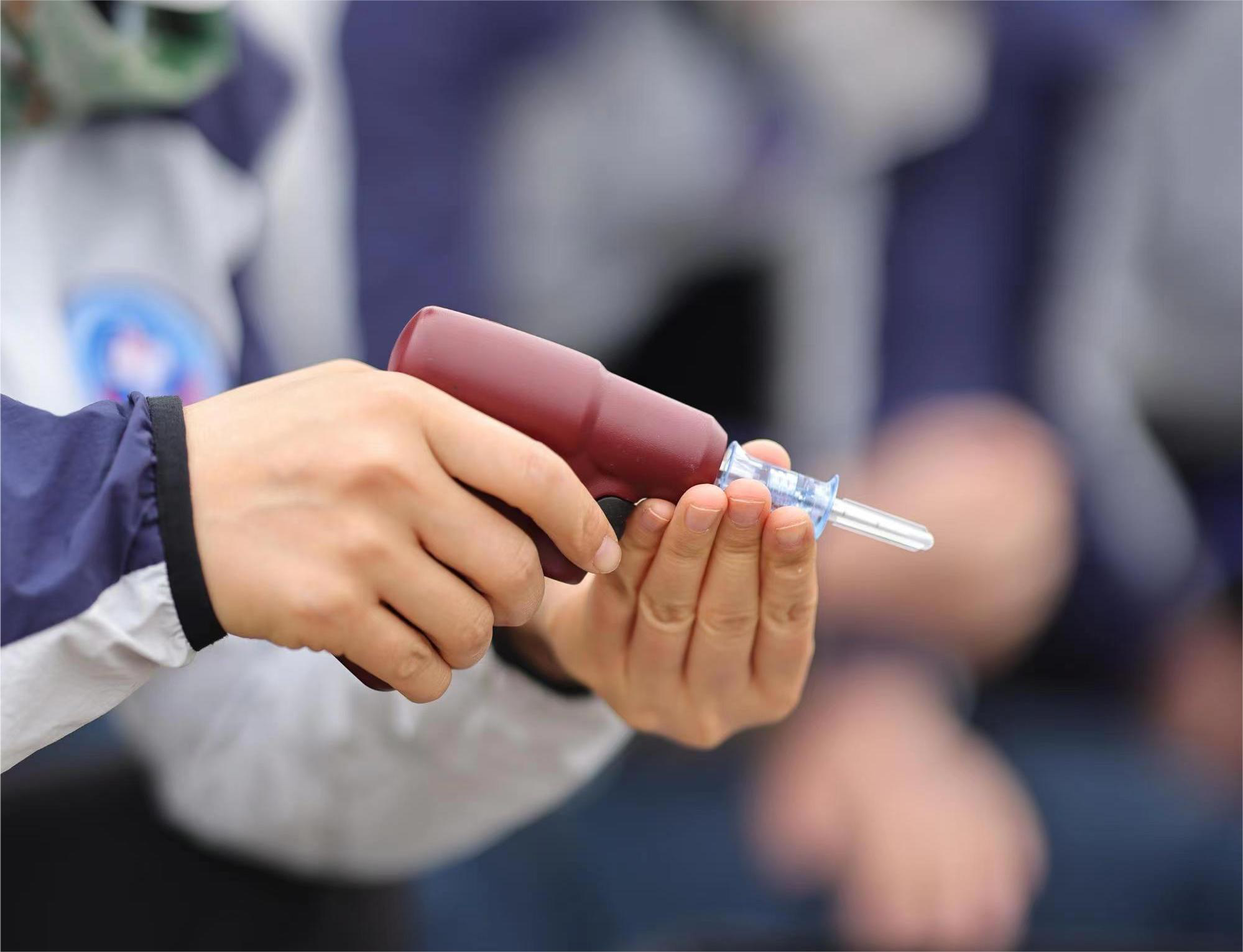 “这是目前国内非常先进的骨髓腔穿刺枪。”队员孙晓微介绍道。为提高急救能力,在不断创新优化保障流程和治疗方案的同时,医疗队还更新配备了全新的除颤监护仪、呼吸机、吸引器和骨髓穿刺枪,相继引进添置了数字式胸腔引流系统、可视喉镜、背负式碳纤维氧气瓶等设备。医疗队员周君君介绍,医疗队所用设备均按三套配置,加配一套备用;所有用电设备均配备三块备用电池,保证续航时间;所有设备均配备操作流程卡片,每名队员均熟练掌握。