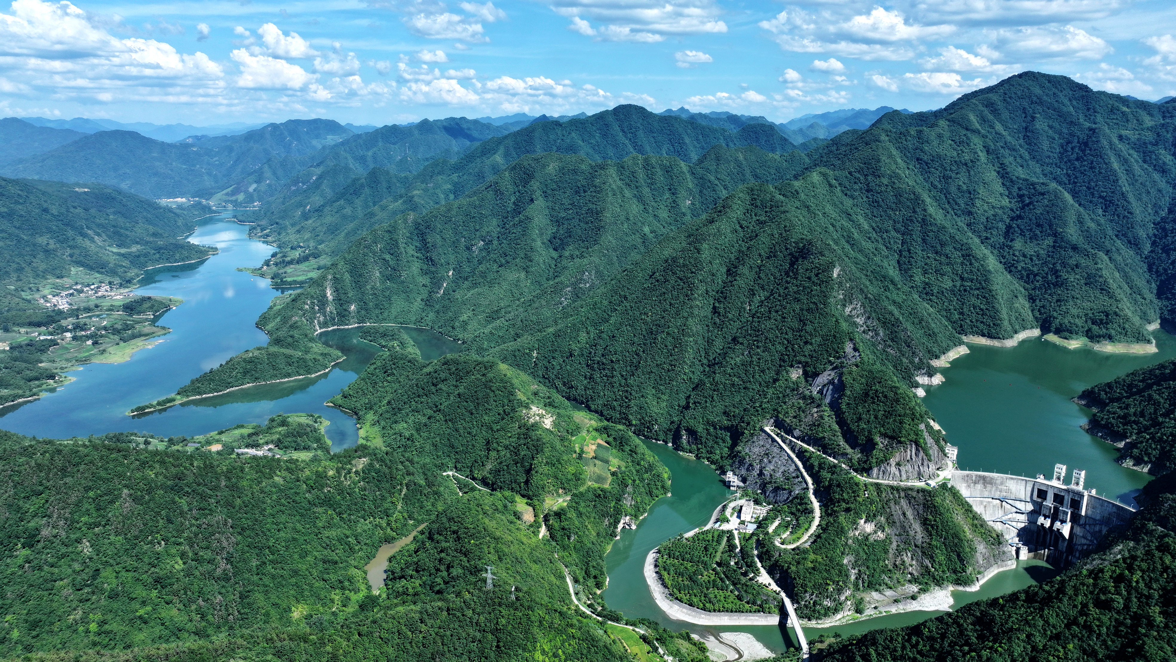 2024年7月22日,湖北省十堰市房县南河青峰镇台口村区域山峦叠翠,蓝天白云与碧水清波相映成趣,一河净水直入长江流域。张启龙/人民图片