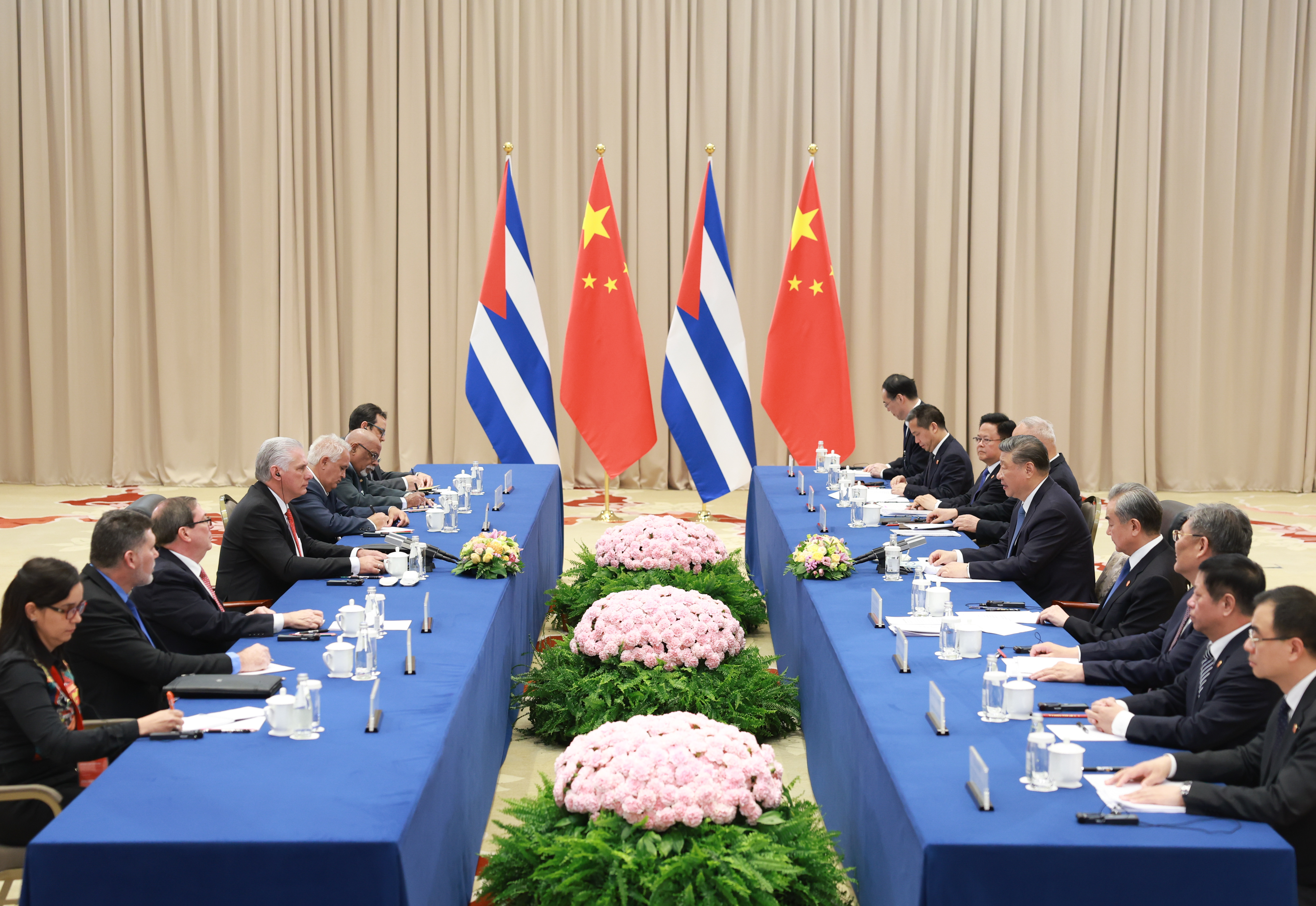 习近平指出,近年来,我同主席同志多次会晤,共同引领中古关系进入政治互信更深厚、战略协作更紧密、民意基础更牢固的新阶段。今年是中古建交65周年,中方愿同古方进一步巩固铁杆情谊,构建更加紧密的中古命运共同体,树立社会主义国家团结合作、发展中国家真诚互助的典范。双方要促进各层级交往、各领域合作进一步走深走实,让高水平政治互信始终成为中古两党两国关系的鲜明标识。中方坚定支持古巴捍卫国家主权、反对外来干涉和封锁,支持古巴经济社会发展。作为全球南方重要成员,双方要在金砖、中拉论坛等框架内加强协调和配合,反对强权政治和单边霸凌,维护国际公平正义。