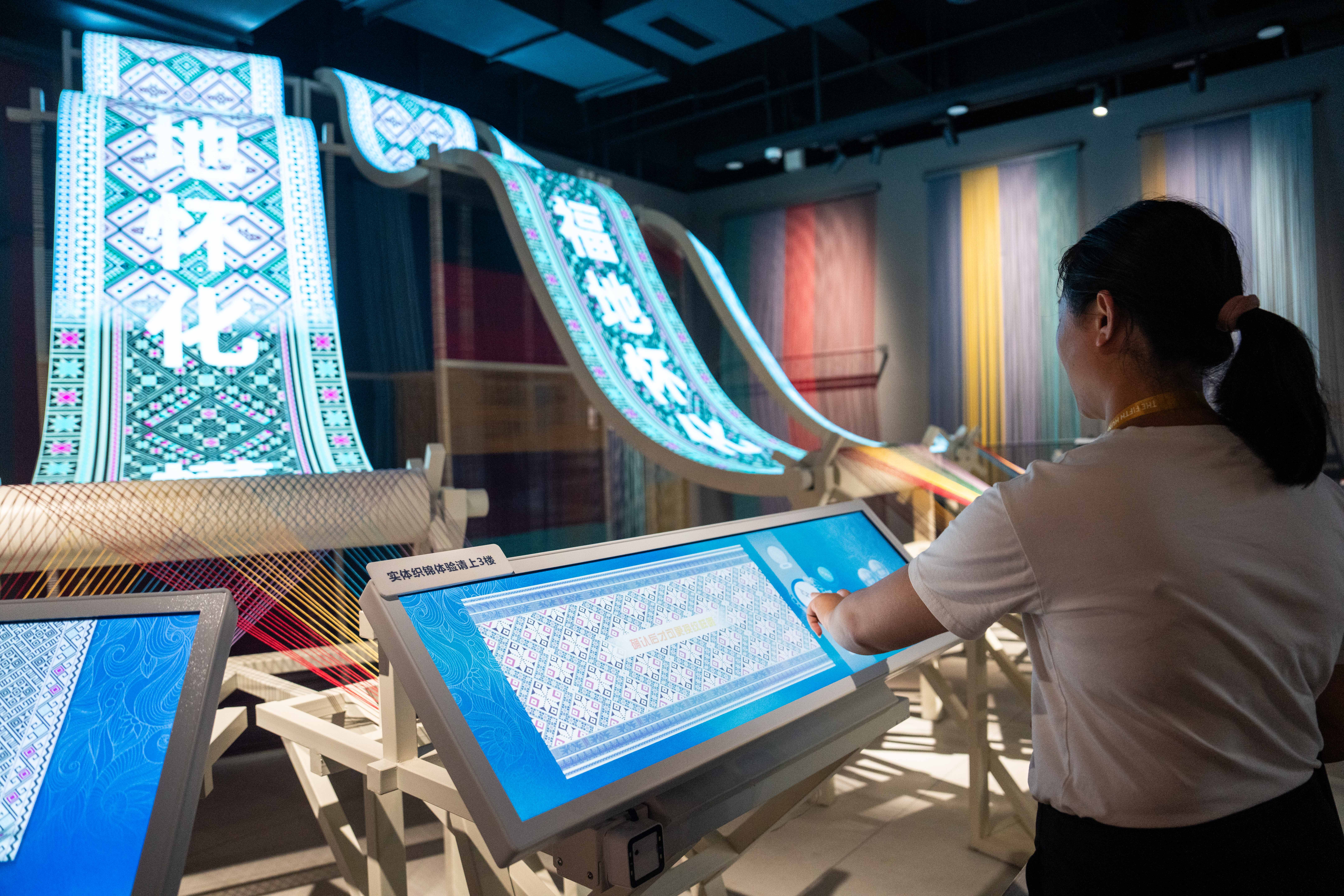 2025年9月16日,游客在湖南省怀化市五溪非遗园体验数字化织锦。五溪非遗园于2025年5月正式开园,包含非遗广场、数字体验空间和研学工坊三大板块,运用VR、AR、全息投影等技术打造42个沉浸式非遗体验项目。目前,怀化以五溪非遗园为抓手,推出非遗主题研学项目、开发深度互动项目,构筑特色文化产业体系,吸引更多人了解、学习非遗,让传统技艺成为城市发展的文化动力。