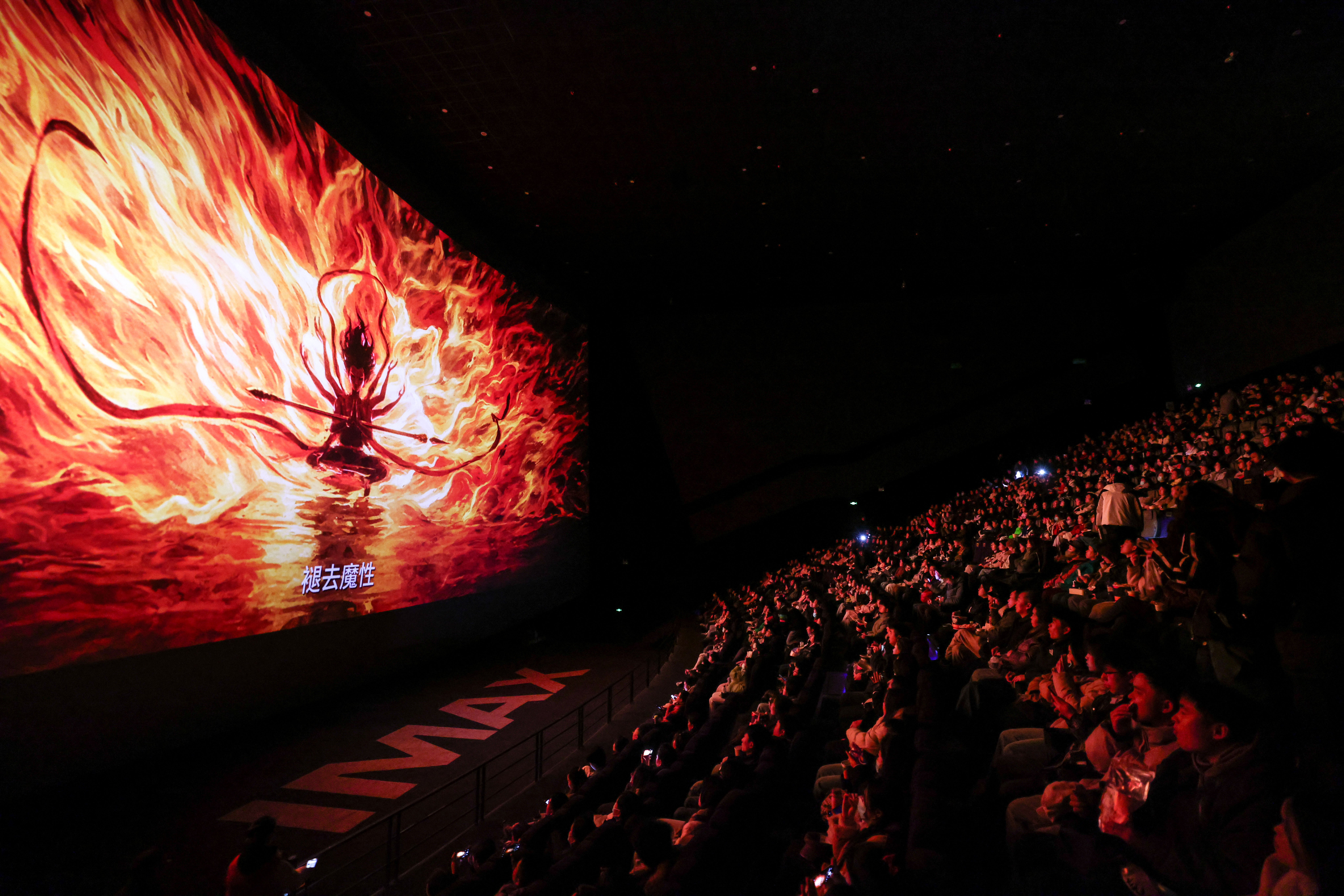 2025年2月25日,观众在贵阳越界影城IMAX影厅内观看电影《哪吒之魔童闹海》。动画电影《哪吒之魔童闹海》自1月29日上映后票房一路高歌猛进,仅用8天便登顶中国影史票房榜,随后成为全球单一市场票房冠军、全球动画电影票房冠军。2025年以来,国家电影局等相继启动“跟着电影品美食”“跟着电影去旅游”“中国电影消费年”活动,充分发挥电影对提振消费的积极作用;各地文旅部门等通过发布观影消费券、举办主题活动等形式推动影旅融合,发展票根经济