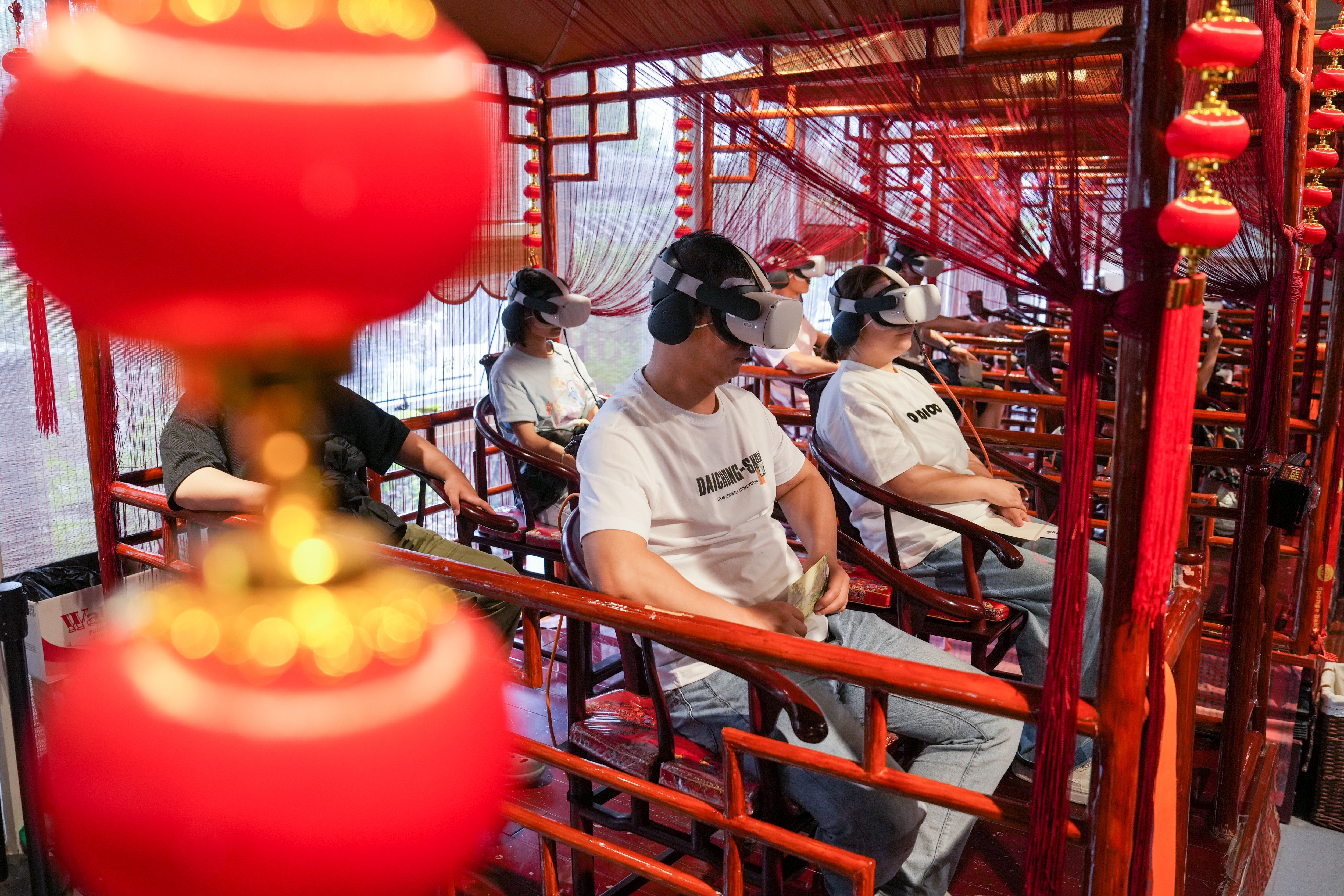 2025年5月18日,游客在苏州拙政园体验VR漫游。当地利用数字化手段,创造“数字云游”VR场景,打造“云游拙政园”“狮林园宇宙”“留园虚拟元宇宙”等项目,营造真实可感的虚拟空间,让观众沉浸式感受苏州园林的独特魅力。近年来,苏州不断推进“数字园林”建设,在园林整体数字建模、园林要素数据库建设、园林“元宇宙”应用场景开发等方面进行探索,加快推动“数字园林”成果全民共享。